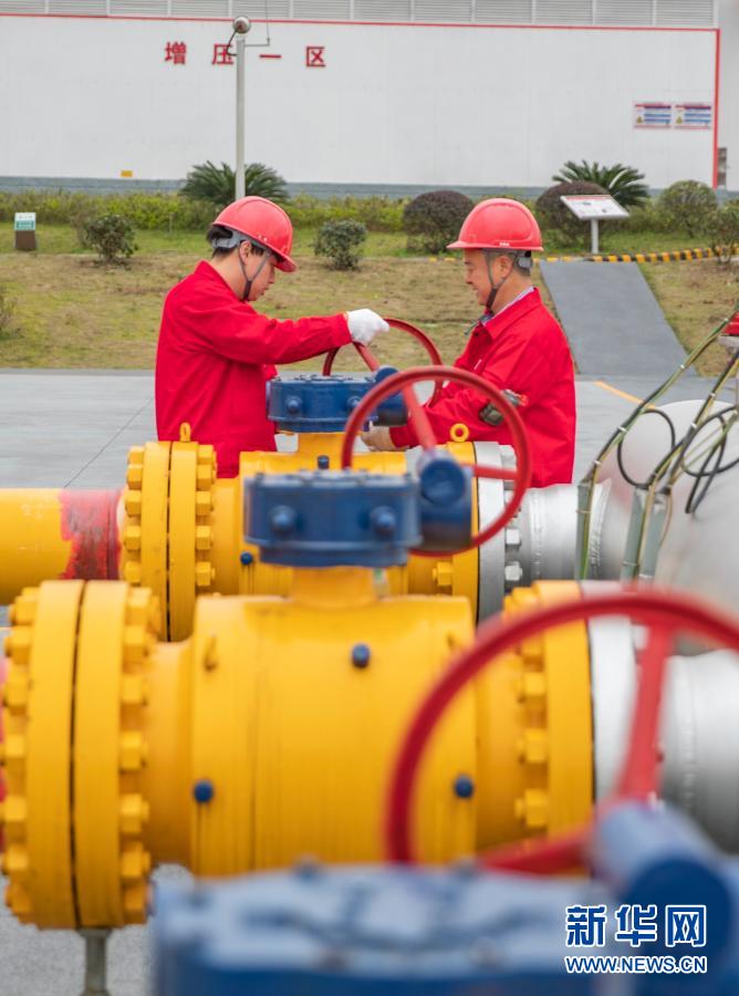 3月14日,中国石油西南油气田公司相国寺储气库工作人员李洪斌(右)、文奇在关闭铜相线阀门。新华社记者 黄伟 摄