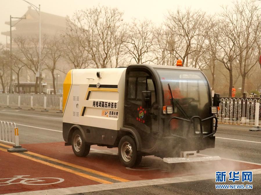 3月15日,环卫工人在北京煤市街清扫路面。当日,北京市遭遇沙尘天气。新华社记者 张晨霖 摄