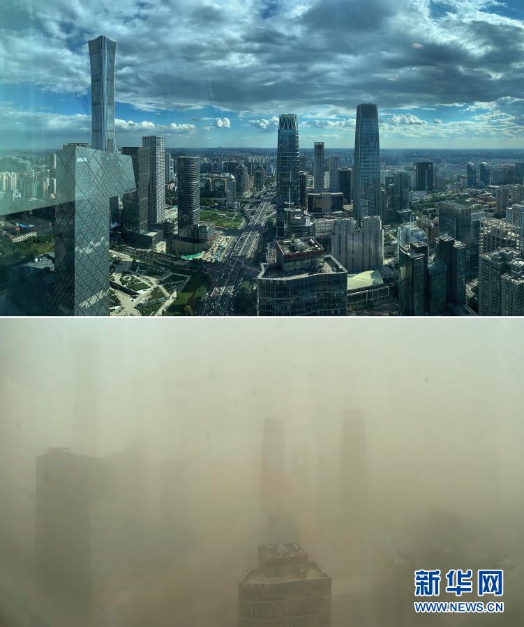 拼版照片,从北京财富中心拍摄的北京CBD地区(上图为2020年9月8日摄,下图为2021年3月15日摄)。当日,北京市遭遇沙尘天气。新华社发(燕苍娜 摄)