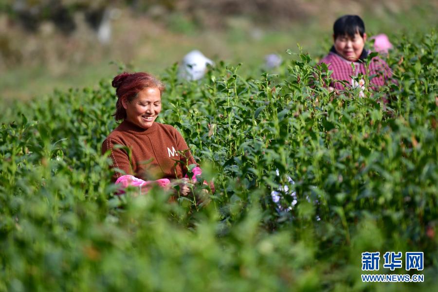 茶农在文县碧口镇马家山村的茶园里采摘春茶(3月14日摄)。近日,甘肃省陇南市文县碧口镇的茶农抢抓晴好天气,在满目青翠的茶园里采摘春茶。新华社记者 陈斌 摄