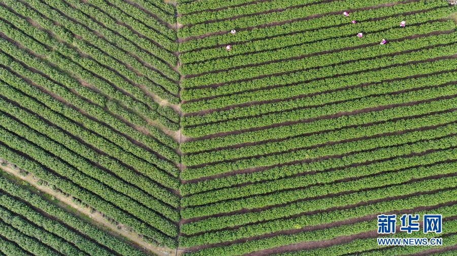茶农在文县碧口镇马家山村的茶园里采摘春茶(3月14日摄,无人机照片)。新华社记者 陈斌 摄