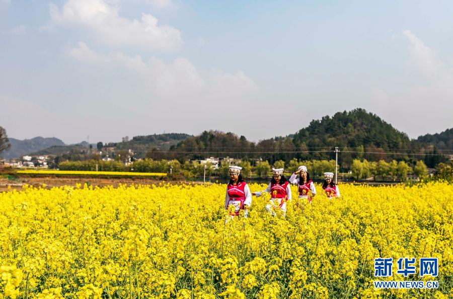 春日里,贵州省毕节市黔西县绿化白族彝族乡大海子村油菜花开放,满目金黄,吸引不少游客前来踏青赏花。