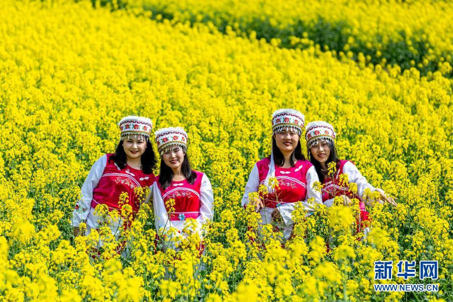 3月15日,几名白族姑娘在大海子村花海中留影。
