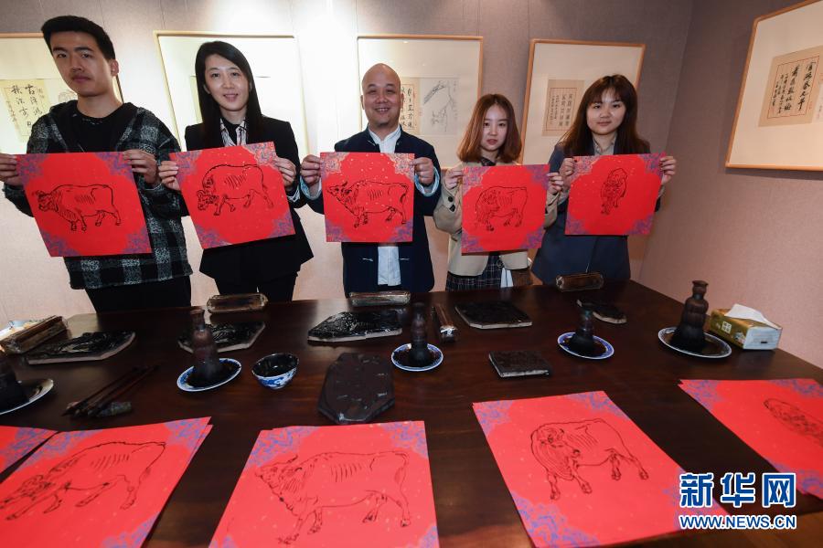 3月16日,在浙江理工大学丝绸博物馆内,国家级非遗项目木版水印技艺代表性传承人魏立中(中)与师生展示刚印制的木版水印作品。新华社记者 徐昱 摄