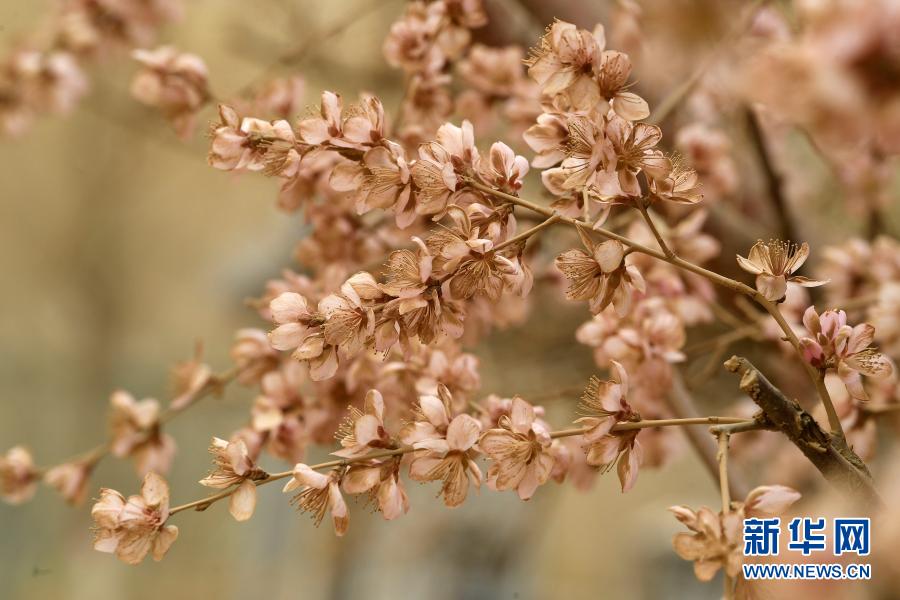 宁夏银川市街头盛开的桃花覆盖了一层沙尘(3月16日摄)。