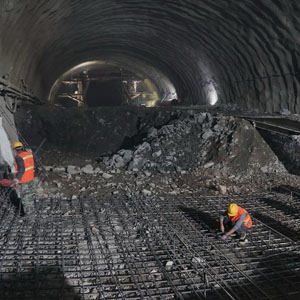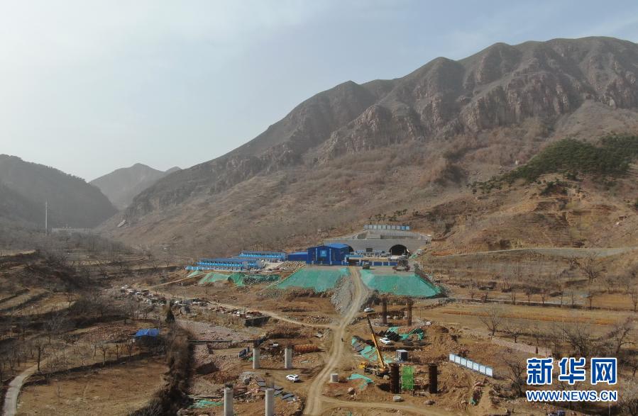 3月16日,工人在迁安市大五里乡境内的京秦高速公路遵(遵化)秦(秦皇岛)段干柴峪隧道建设工地施工(无人机照片)。