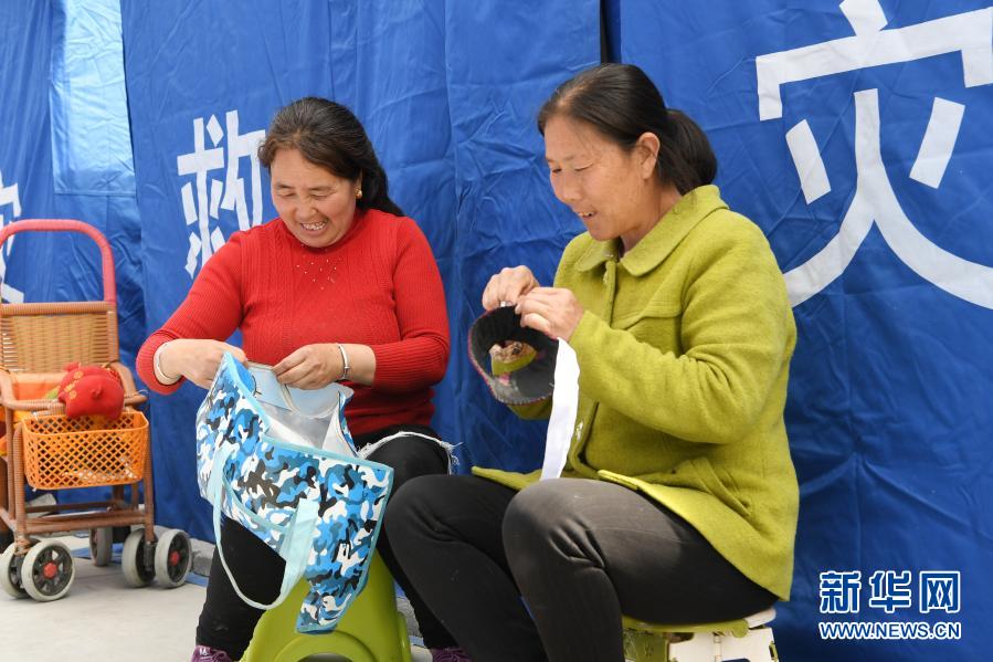 3月16日,在舟曲县果耶镇磨里村、果耶村滑坡灾害应急避险临时安置点,受灾群众在帐篷外做针线。