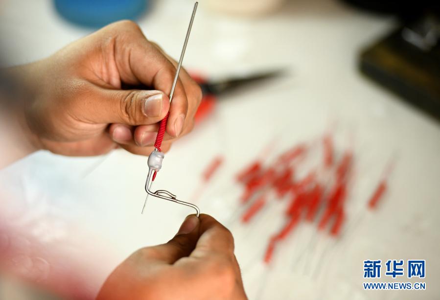3月16日,河北石家庄的戏曲盔头制作维修师朱宝辉在缠制珠须。新华社发(陈其保 摄)