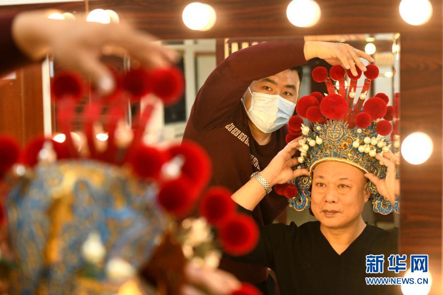 3月16日,戏曲盔头制作维修师朱宝辉(左)在河北省石家庄大剧院后台为演员试戴盔头。新华社发(陈其保 摄)