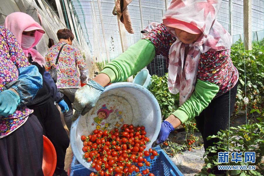 3月16日,山东青岛平度市明村镇巡栈村村民在蔬菜大棚内采摘樱桃西红柿。