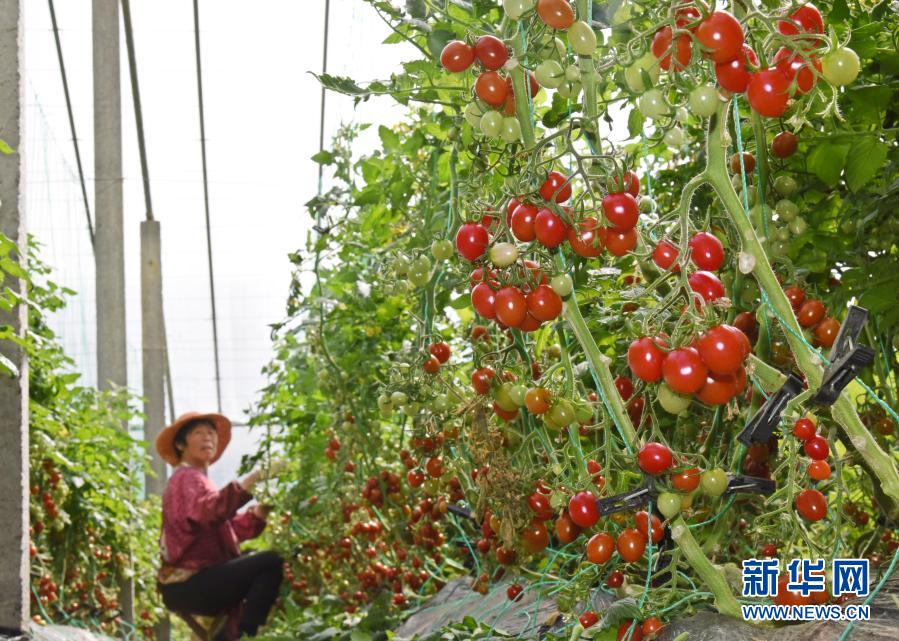 3月16日,山东青岛平度市明村镇巡栈村村民在蔬菜大棚内采摘樱桃西红柿。