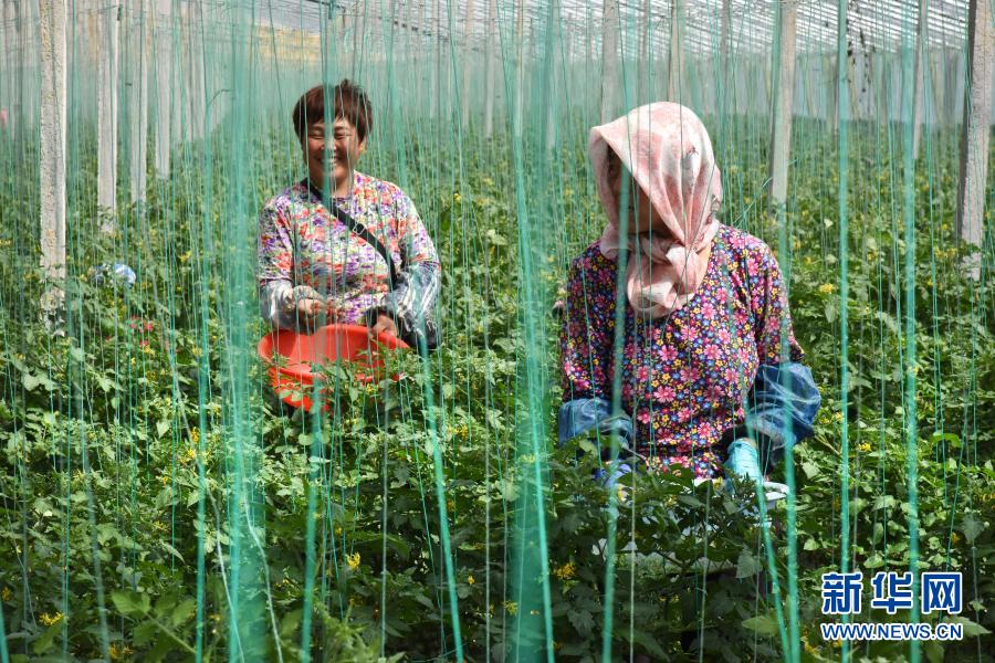 3月16日,山东青岛平度市明村镇巡栈村村民在蔬菜大棚内采摘樱桃西红柿。