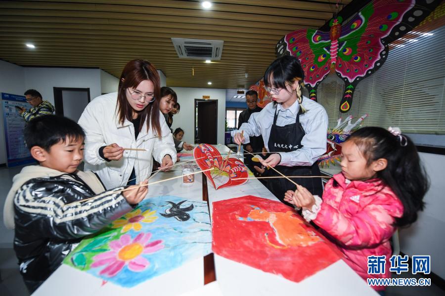 3月17日,孩子们在祥和社区党群服务中心内学习制作风筝。