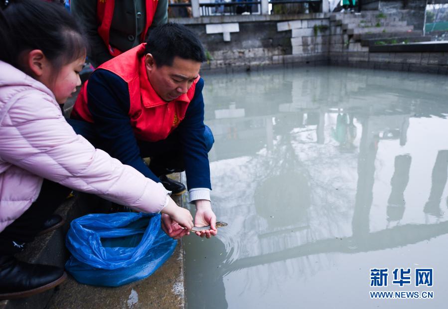 3月17日,龙泉小学的学生和社区党员志愿者一起在龙溪港边放鱼苗。