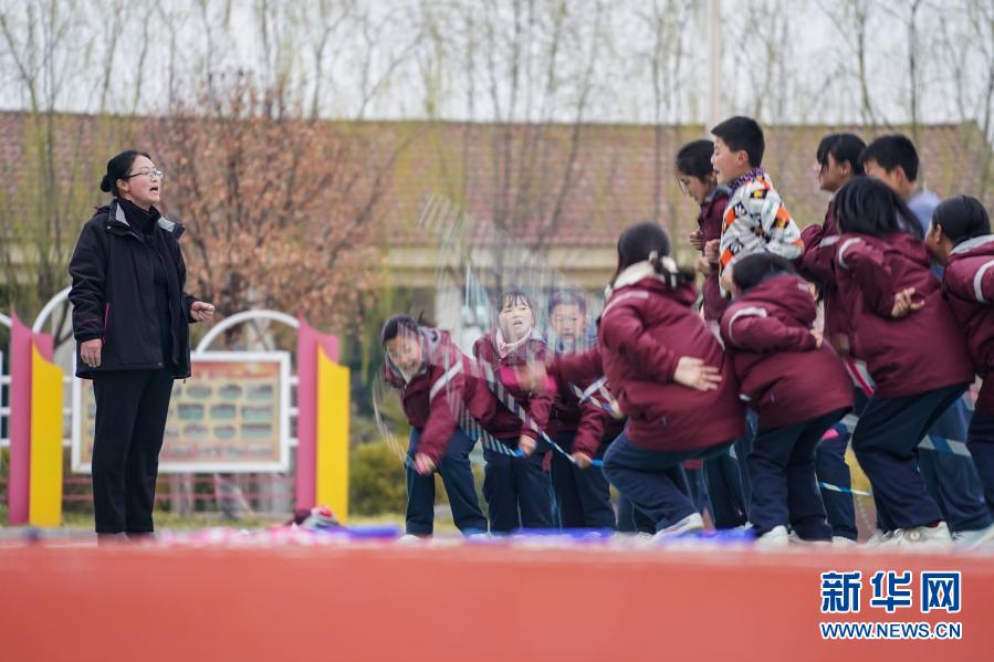 骑路小学刘彦老师(左一)指导同学们练习"大网绳跳"(3月9日摄)。新华社记者 李博 摄