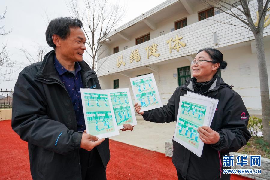 骑路小学刘彦老师(右)和校长刘恩展示以学生命名的花样跳法卡片(3月9日摄)。新华社记者 李博 摄
