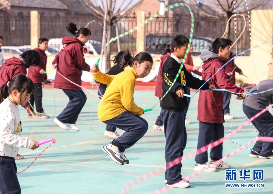 骑路小学的学生们在体育课上进行跳绳锻炼(3月10日摄)。新华社记者 杨磊 摄