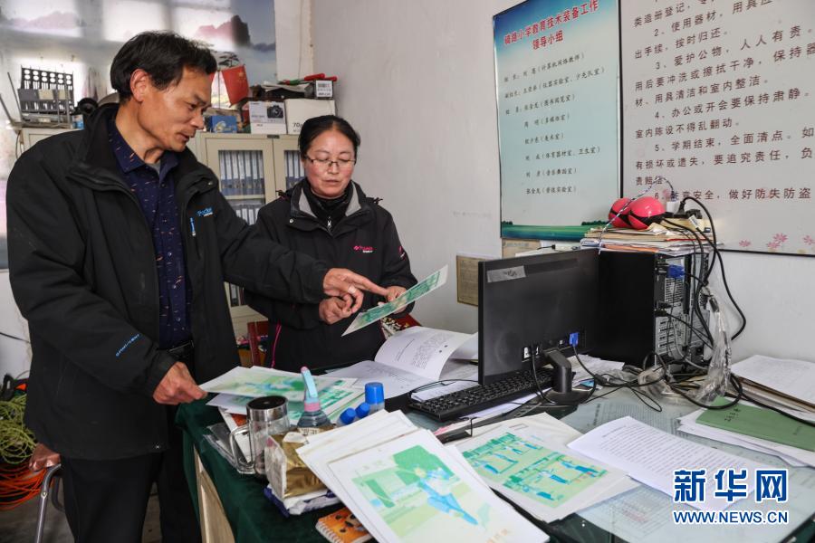 骑路小学刘恩校长(左)和刘彦老师商讨跳绳课程纲要(3月9日摄)。新华社记者 杨磊 摄