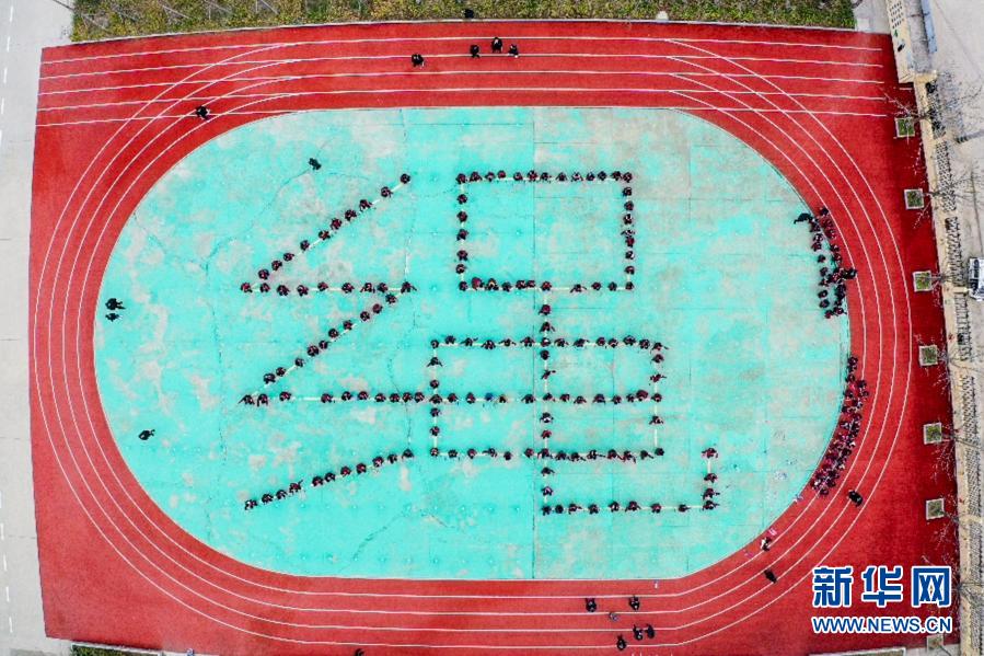 骑路小学的学生们在操场上排列站队成“绳”字造型(3月9日摄,无人机照片)。新华社记者 李博 摄