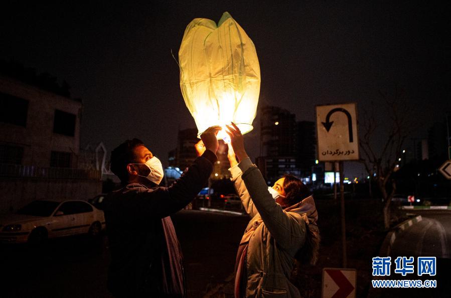 3月16日深夜,伊朗民众在首都德黑兰街头庆祝“跳火节”时点燃孔明灯。