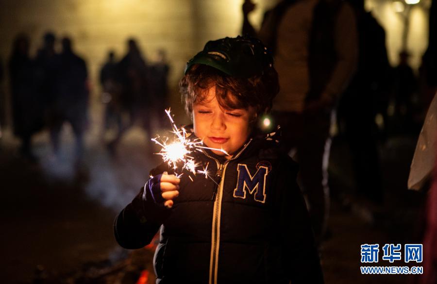 3月16日深夜,伊朗儿童在首都德黑兰街头庆祝“跳火节”时燃放烟火。