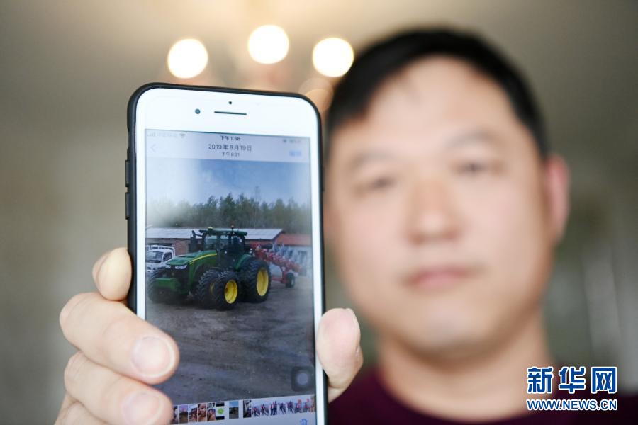 八五〇农场种粮大户袁志欣展示自己购买的大型农机的照片(3月4日摄)。新华社记者王建威摄
