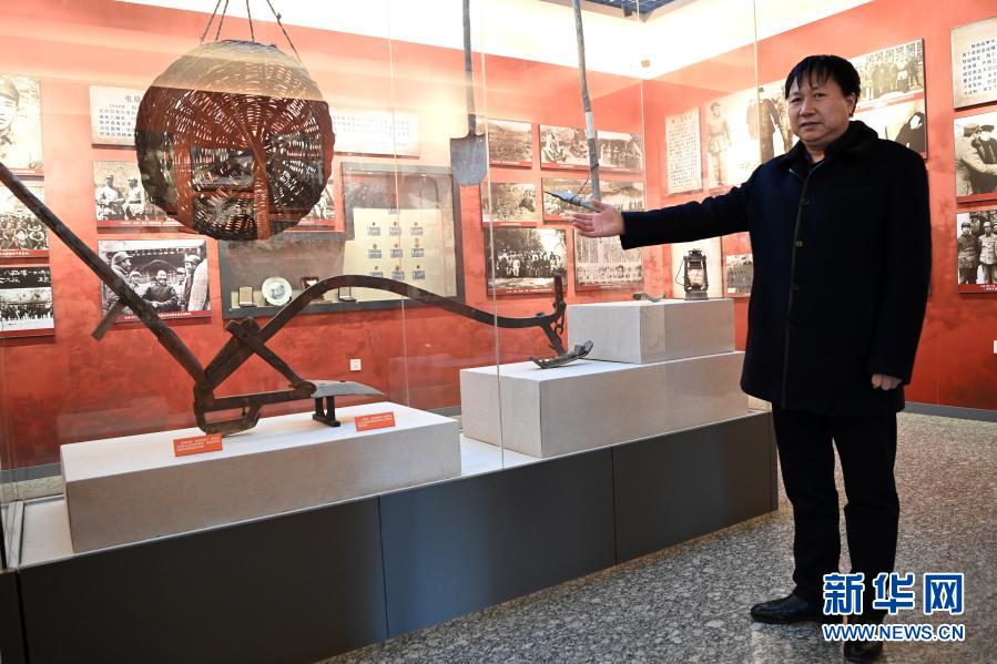 在北大荒开发建设纪念馆,馆长丁军介绍当年使用的农具(3月5日摄)。新华社记者王建威摄