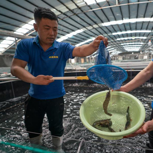 3月17日,河北省黄骅市一家养殖专业合作社的工人在查看种虾的健康情况。