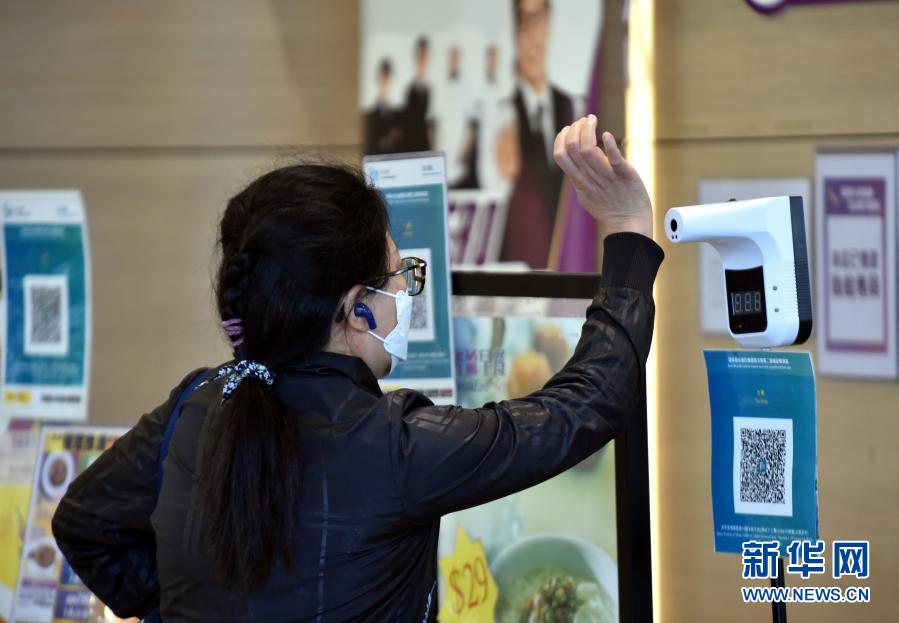 香港市民佩戴口罩进入餐厅时检测体温(3月17日摄)。