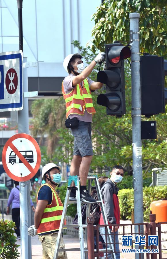 维修工人在街头修理交通灯(3月17日拍摄)。