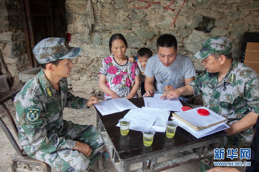 湖北省恩施军分区“131”扶贫小分队到对口帮扶的红土乡天落水村村民家中入户核实相关情况(2018年7月4日摄)。新华社发(王海 摄)