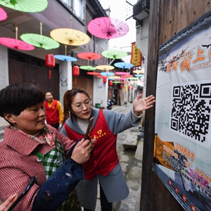 3月18日,河桥镇党员志愿者在河桥老街上向村民推广“一村一码”微信小程序。
