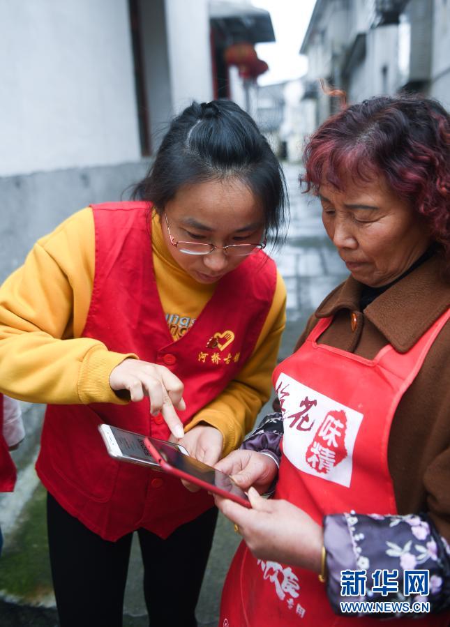 3月18日,河桥镇党员志愿者在河桥老街上向村民推广“一村一码”微信小程序。新华社记者 徐昱 摄