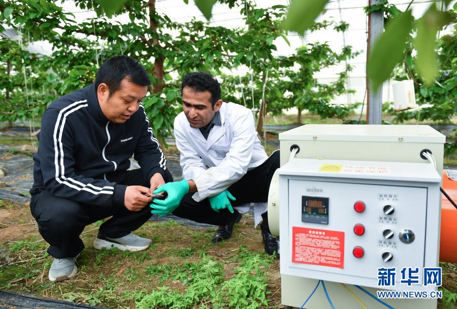 3月17日,在陕西杨凌锦田农业专业合作社,农民李海平向金乐天(右)讲解一款大棚控温设备。