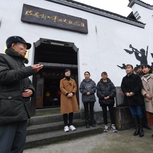 3月18日,在杭州市临安区板桥镇的临安新四军历史纪念馆,90岁的孟永迪老人(左一)在给乡镇的入党积极分子讲述革命历史和他自己参加过的解放战争的亲身经历。