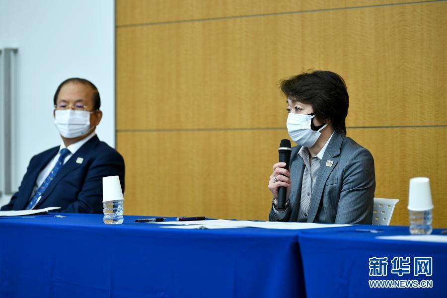 3月18日,东京奥组委主席桥本圣子(右)和首席执行官武藤敏郎在日本东京的紧急发布会上。新华社/POOL/野木一广