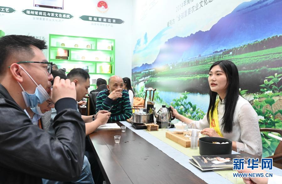 3月18日,一家茉莉花茶企业工作人员(右)在向客人介绍福州的茉莉花茶。