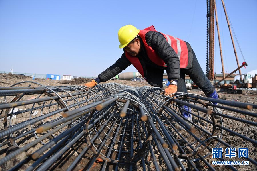 3月18日,工人在哈尔滨冰雪大世界四季冰雪项目施工现场作业。