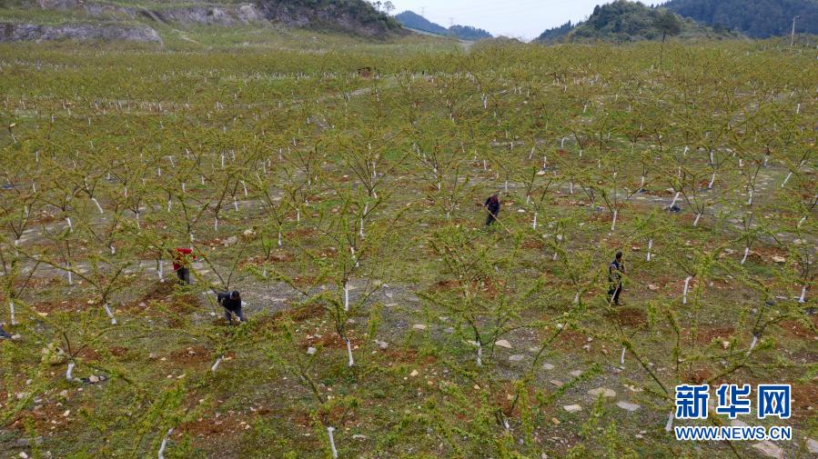 3月18日,村民在重庆市北碚区静观镇中华村的矿山果园劳作(无人机照片)。