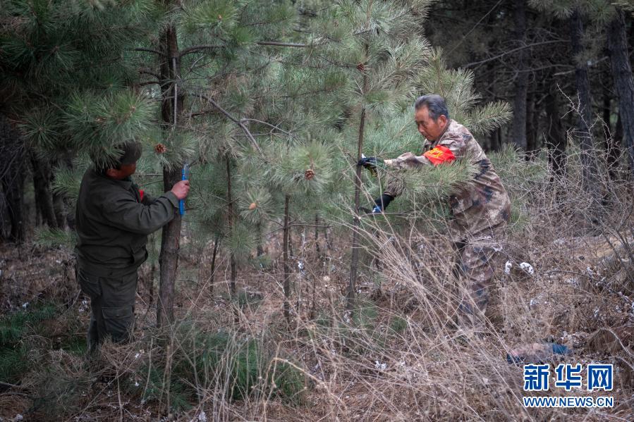 3月17日,秦安松(右)和同事在山上给树木修枝。
