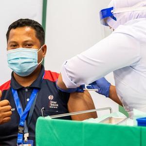 3月18日,医护人员在马来西亚森美兰州林茂地区一家医院为抗疫一线人员接种中国科兴公司生产的克尔来福新冠疫苗。