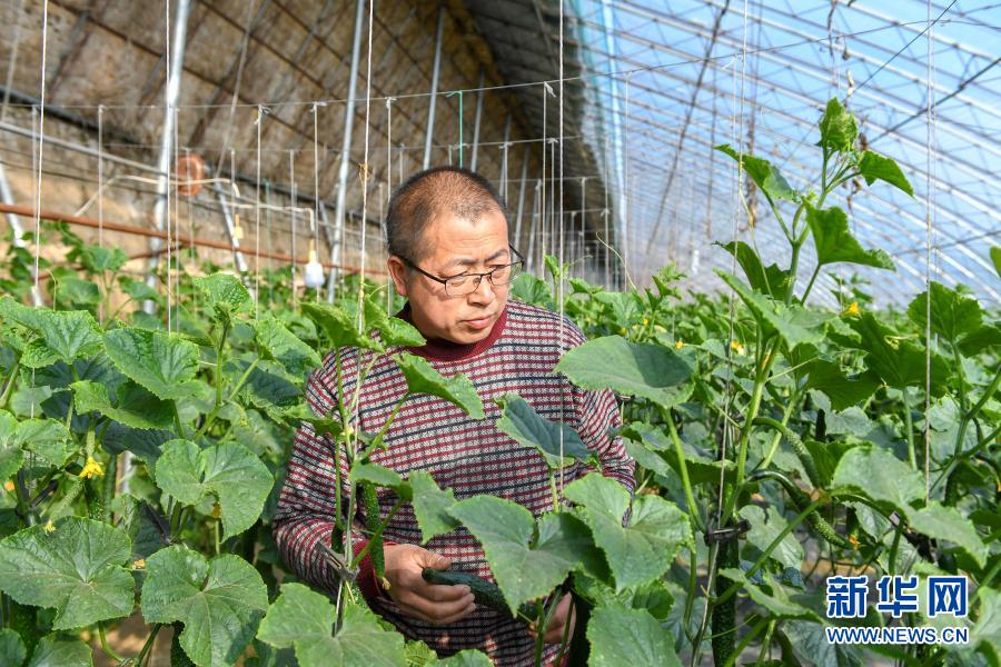 3月19日,在梨树县盛园蔬菜种植养殖专业合作社,农民在查看黄瓜长势。