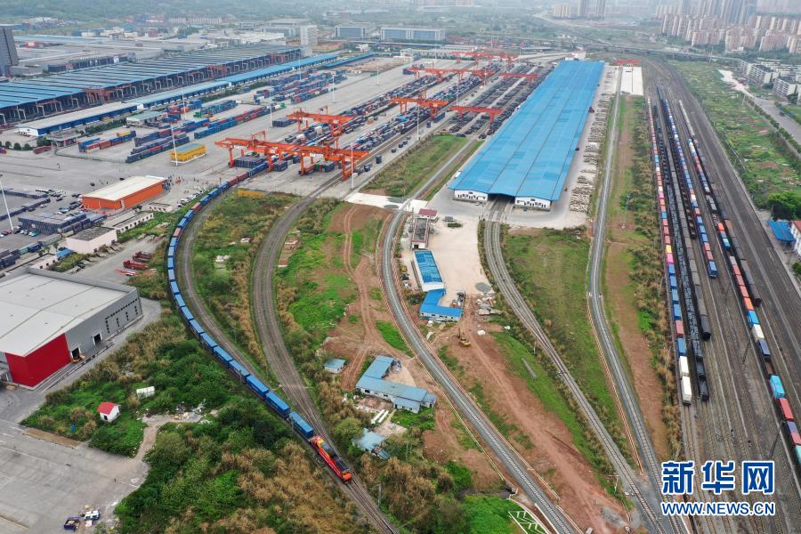3月19日,中欧班列(渝新欧)十周年纪念专列从重庆团结村车站发出(无人机照片)。新华社记者 唐奕 摄