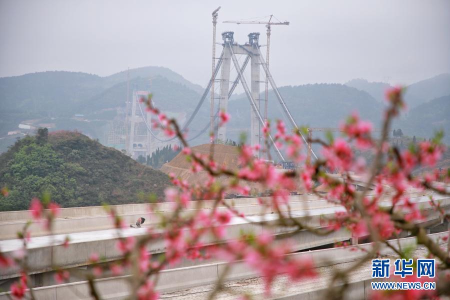 3月19日,一簇桃花盛开在紧张建设中的瓮开高速边。