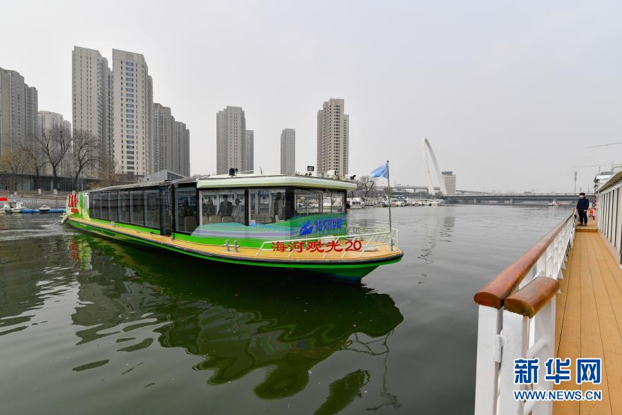 3月19日,纯电动新能源海河游船“人民号”准备停靠码头,迎接新航季首批游客。