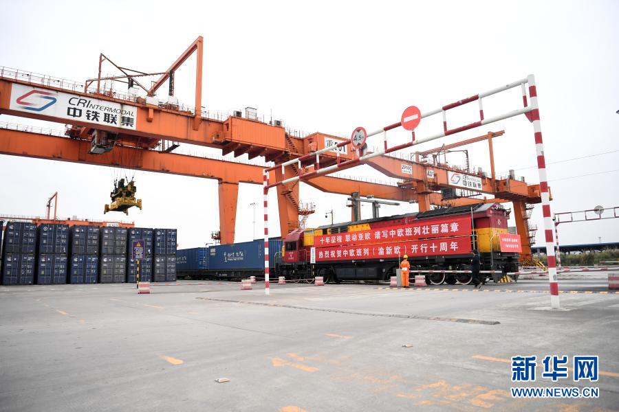 3月19日,中欧班列(渝新欧)十周年纪念专列在重庆团结村站等待发车。新华社记者 唐奕 摄