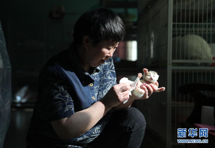 3月17日,于桂香为一只刚出生不久的宠物猫幼崽清理身体。