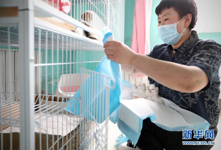 3月18日,于桂香为出生不久的宠物猫幼崽更换护理垫。