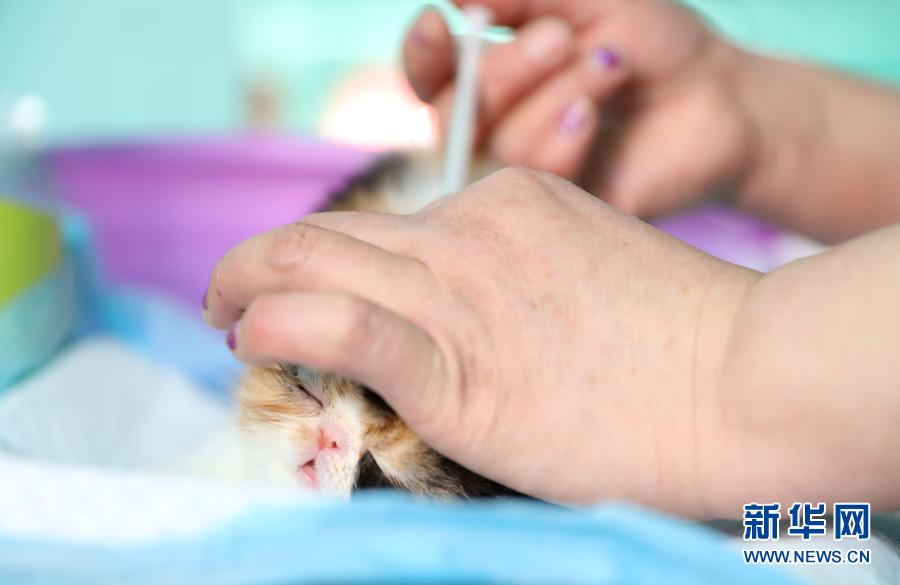 3月17日,于桂香为出生不久的宠物猫幼崽打针。