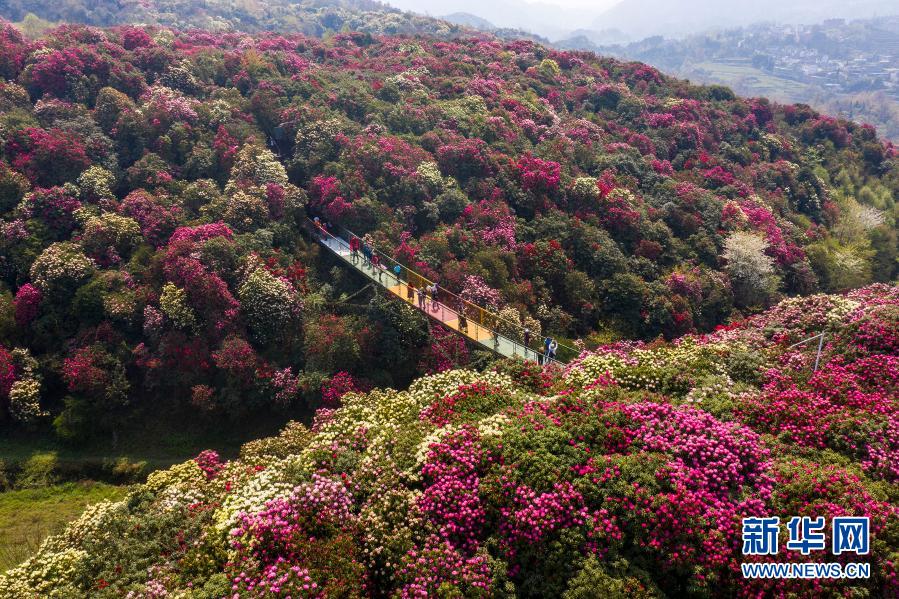 3月19日,在百里杜鹃管理区金坡景区,游客在索玛花桥上赏花拍照(无人机照片)。新华社发(李华 摄)